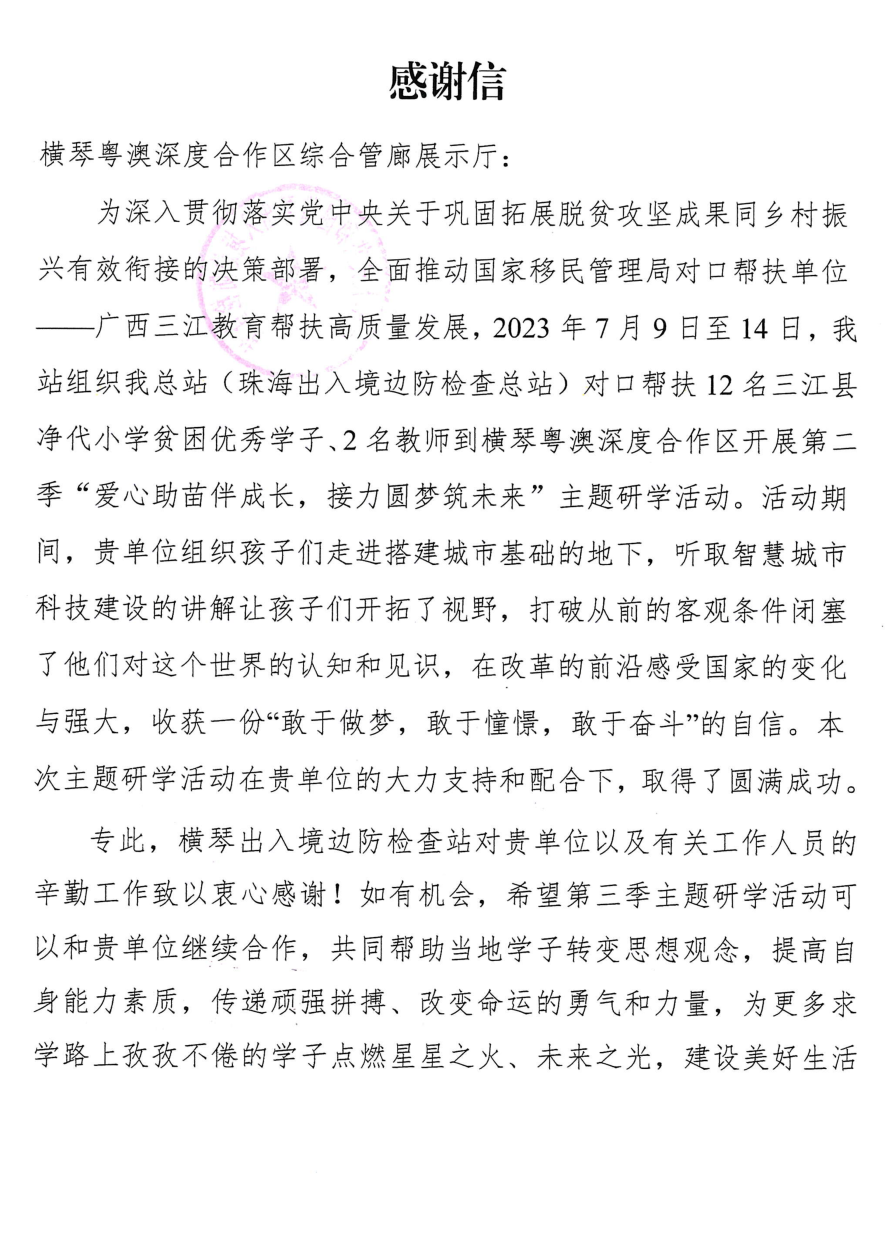 積極協(xié)助橫琴出入境邊防檢查站的“愛心助苗伴成長,接力圓夢筑未來”活動,從云端到地下娓娓介紹,幫助優(yōu)秀三江學子感知國際化都市的發(fā)展脈搏,了解智慧城市的科技建設,得到橫琴出入境邊防檢查站和參觀學子的肯定和感謝。