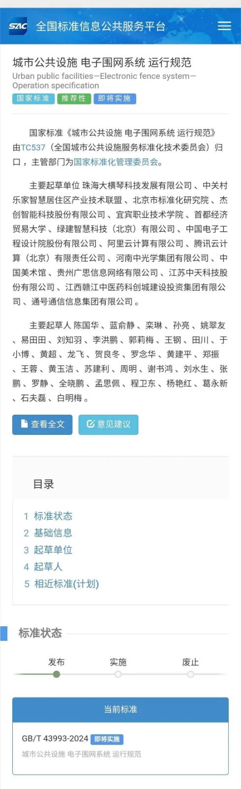 GB/T 43993-2024《城市公共設(shè)施 電子圍網(wǎng)系統(tǒng) 運(yùn)行規(guī)范》于2021年12月立項(xiàng),由大橫琴科技公司主導(dǎo)制定,TC537全國城市設(shè)施服務(wù)標(biāo)準(zhǔn)化技術(shù)委員會提供指導(dǎo)。標(biāo)準(zhǔn)制定工作組經(jīng)過深度場景調(diào)研、密集專題討論、廣泛征求意見、嚴(yán)格技術(shù)審查,歷經(jīng)兩年研制周期,最終確立了電子圍網(wǎng)系統(tǒng)運(yùn)行架構(gòu),明確了運(yùn)行總體原則,并對電子圍網(wǎng)系統(tǒng)的運(yùn)行資源、運(yùn)行服務(wù)、運(yùn)行評價(jià)改進(jìn)進(jìn)行了全面規(guī)范化。該標(biāo)準(zhǔn)于2024年4月25日正式發(fā)布,并于2024年11月1日起正式實(shí)施。