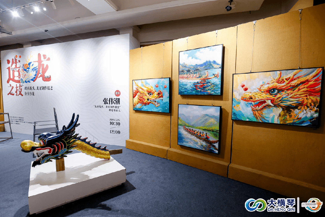 斗門龍舟賽深厚底蘊(yùn),不僅僅是一場(chǎng)水上競(jìng)渡,更是一系列民俗文化的集大成者。睇龍船、嘆非遺,與比賽同步進(jìn)行的,還有“龍騰黃楊——珠海龍舟民俗文化藝術(shù)展”和傳承人張偉潮分享的“端午龍舟龍頭龍尾制作技藝”沙龍。