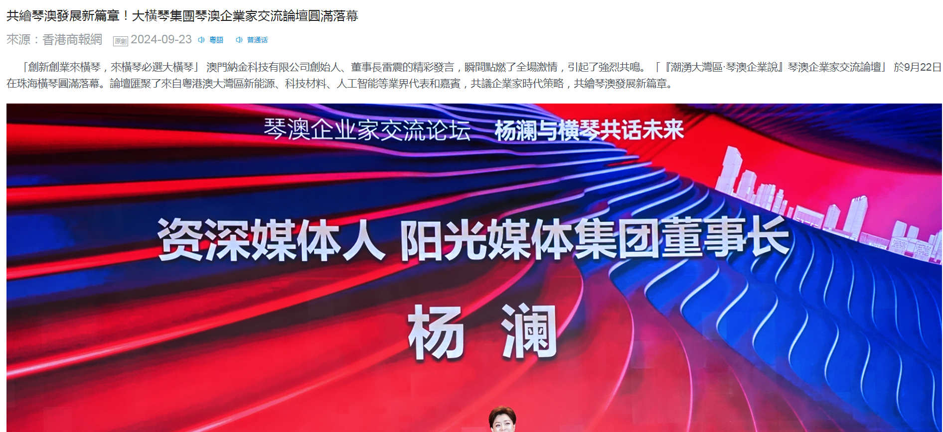 「創(chuàng)新創(chuàng)業(yè)來橫琴,來橫琴必選大橫琴」 澳門納金科技有限公司創(chuàng)始人、董事長雷震的精彩發(fā)言,瞬間點燃了全場激情,引起了強烈共鳴?!浮撼睖ゴ鬄硡^(qū)·琴澳企業(yè)說』琴澳企業(yè)家交流論壇」 於9月22日在珠海橫琴圓滿落幕。論壇匯聚了來自粵港澳大灣區(qū)新能源、科技材料、人工智能等業(yè)界代表和嘉賓,共議企業(yè)家時代策略,共繪琴澳發(fā)展新篇章。