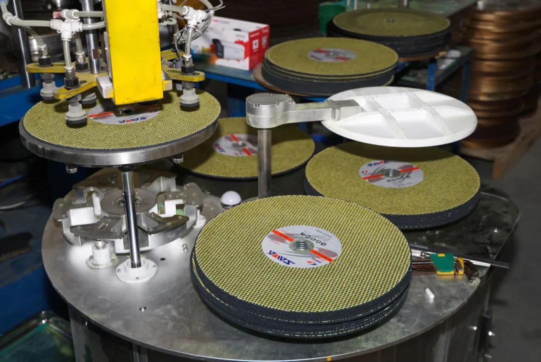 步入車間,智能化設(shè)備高效運(yùn)轉(zhuǎn),厚度1至6毫米的砂輪經(jīng)過(guò)精密加工后整齊排列,即將發(fā)往全球市場(chǎng)。