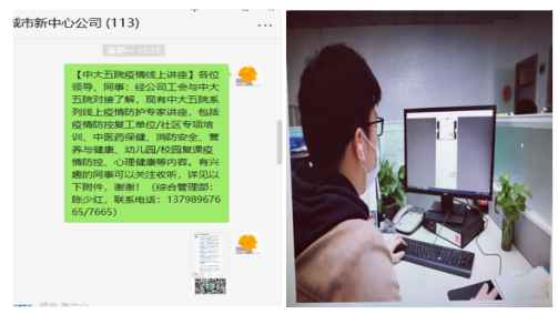 為進(jìn)一步做好疫情防控工作,提升職工疫情防控知識及提高心理調(diào)適能力,城市新中心公司工會與中大五院健康管理科聯(lián)系對接,組織職工收聽中大五院疫情防護(hù)系列專家講座。
